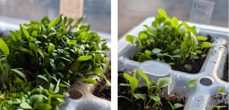 I experimented with growing microgreens with seeds from common weeds in the alleys. Everyone says dandelion greens are so delicious (second pic) but I actually greatly prefer Curly Dock (first pic).