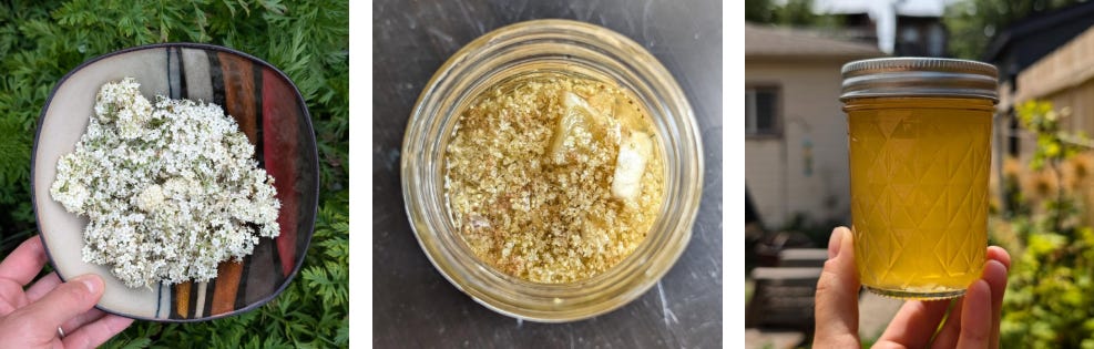 American Elderberry flowers + 1 part sugar + 1 part boiling water + lemon slices. Let it sit on the counter for a day or two, then strain. It’s that easy. Don’t rinse the flowers beforehand or else you’ll remove all the yumminess. It’s bright, thick, floral, and delicious.